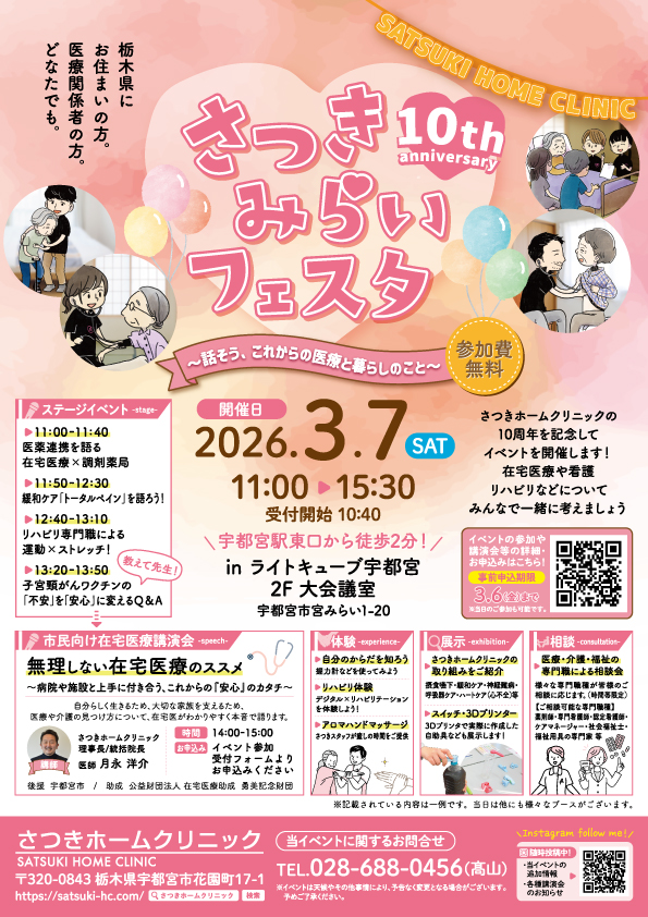 さつきホームクリニックでは開院10周年を記念して、ライトキューブ宇都宮 2F 大会議室にて、2026年3月7日(土)に「さつきみらいフェスタ」を開催いたします。